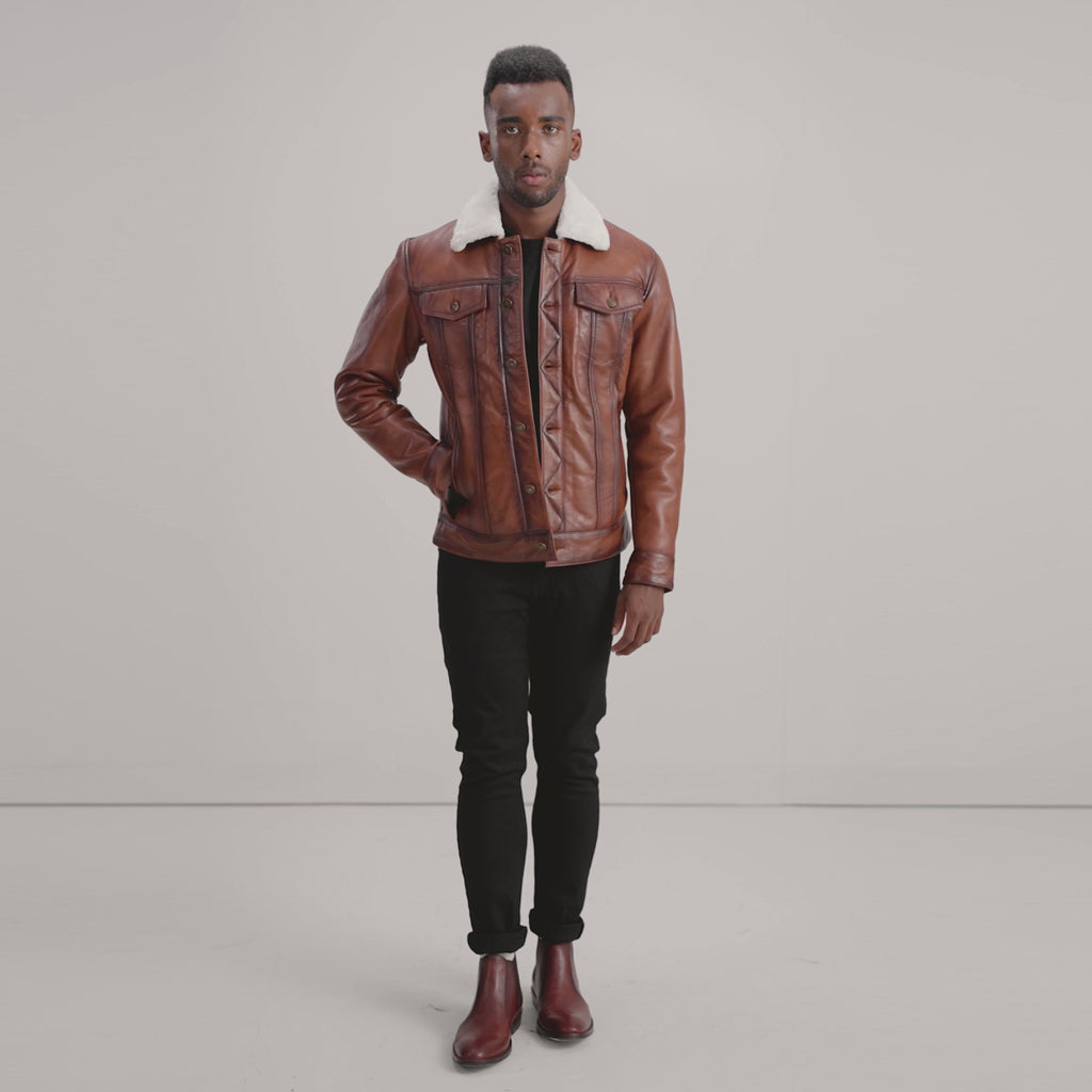 Dallis Brown Leather Shearling Trucker Jacket