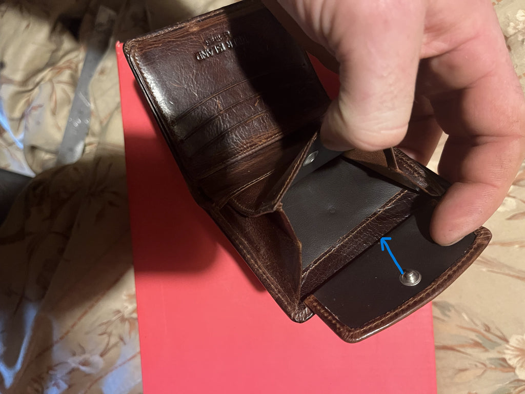 - One large coin pocket having snap button closure as the right panel, and a slip pocket under the bottom of that coin pocket (as per reference picture having an indication with blue arrow)