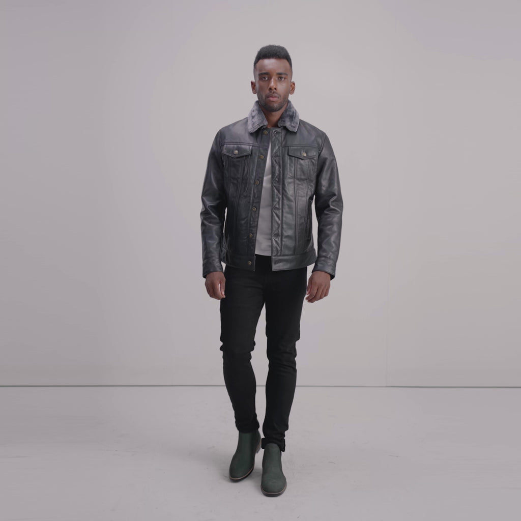Dallis Black Leather Shearling Trucker Jacket